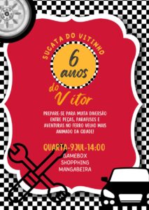 O meu neto, Vítor Lucena, vai fazer aniversário na quarta-feira da próxima semana, dia 9 de julho, com uma festa de arromba no Game Box do Mangabeira Shopping. Apaixonado por carros, Vitinho também adora um “Ferro Velho”. Tanto é que o tema de sua festa será A SUCATA DO VITINHO.