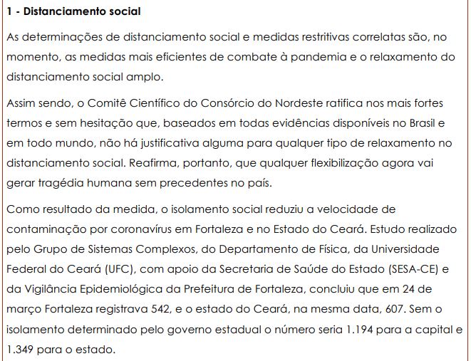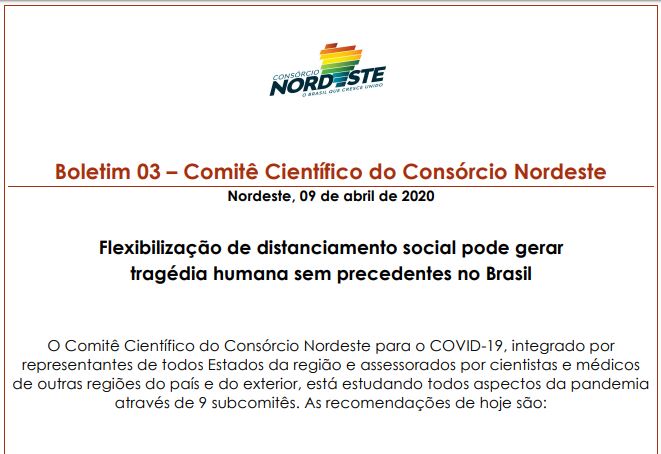 No boletim, o Comitê analisa que não há justificativa para o relaxamento no distanciamento social. Ainda de acordo com levantamento feito pelo grupo, o isolamento estabelecido pelos estados ajudou a reduzir a velocidade de contaminação.