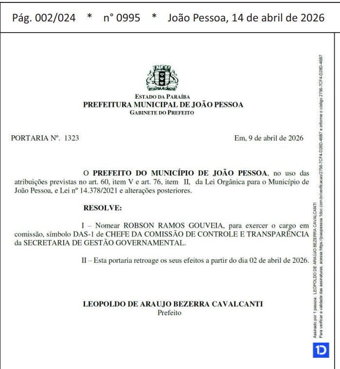 O prefeito de João Pessoa, Leo Bezerra, oficializou uma nova nomeação na estrutura administrativa da capital e escolheu Robson Ramos Gouveia, filho da ex-vereadora Eva Gouveia para cargo de chefia chefia da Comissão de Controle e Transparência da Secretaria de Gestão Governamental da Prefeitura.