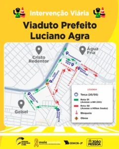 A partir desta terça-feira (20) o Departamento de Estradas de Rodagem (DER) vai iniciar a segunda etapa das obras no entorno do novo Viaduto Luciano Agra, localizado na BR-230, entre os bairros de Água Fria e Cristo Redentor. Com o objetivo de reduzir os transtornos no tráfego, a Superintendência Executiva de Mobilidade Urbana (Semob-JP) vai iniciar uma intervenção viária na região, realizando interdições e viabilizando rotas alternativas aos condutores.