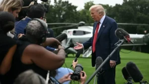 O presidente dos EUA, Donald Trump, fala à imprensa antes de embarcar no Marine One no gramado sul da Casa Branca, em Washington, DC, em 1º de agosto de 2025. Trump está viajando para Nova Jersey para passar o fim de semana em sua residência em Bedminster.