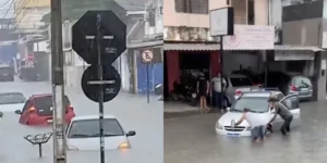 As fortes chuvas que atingiram João Pessoa no início do dia desta quarta-feira (8) provocaram alagamentos em diferentes pontos da cidade, deixando ruas parcialmente submersas e dificultando o tráfego. Um dos locais mais afetados foi a lateral do Mercado da Torre, onde veículos ficaram praticamente encobertos pela água.